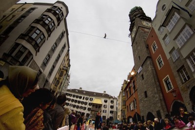 Slackline-Profi Christian Waldner wird auf Einladung der Area 47 - Europas größtem Outdoor-Adventure-Park im Ötztal - auf einer "highline" eine waghalsige Hochseil-Show in 25 m Höhe vor dem Goldenen Dachl vom Stadtturm zum Katzung-Haus bieten.